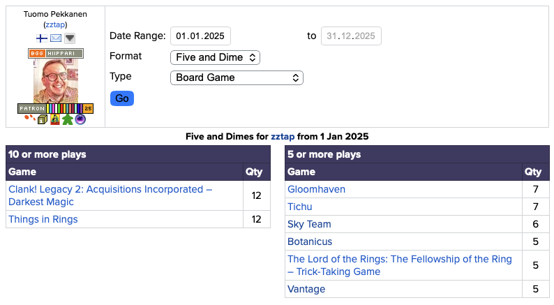 Vuosi 2025 oli lautapelaamisen näkökulmasta merkittävästi aikaisempia vuosia heikompi. Pelimäärissä tiputtiin 10 viime vuoden toiseksi heikommalle tasolle. Osa tätä syytä saattaa olla se, ettei puolison kanssa olla oikein jaksettu ja...