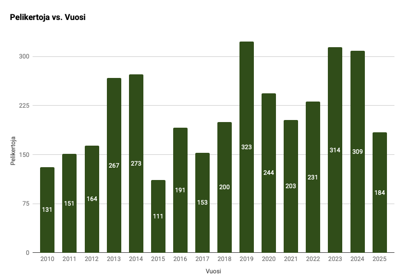 Vuosi 2025 oli lautapelaamisen näkökulmasta merkittävästi aikaisempia vuosia heikompi. Pelimäärissä tiputtiin 10 viime vuoden toiseksi heikommalle tasolle. Osa tätä syytä saattaa olla se, ettei puolison kanssa olla oikein jaksettu ja ehditty pelata juuri mitään vuoden aikana. Kaikki yhteinen vapaa-aika tuntui viime vuonna menevän johonkin ”oleellisempaan”. Pääasiallinen paikka peleille onkin siis ollut edelleen Tavernan viikkopeleissä.